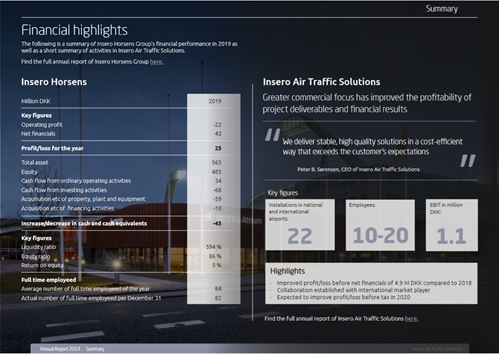 The annual report for Insero Air Traffic Solutions shows a positive result for 2019. The positive result for the year amounts to DKK 1,278k after taxation which is as expected and according to strategy.