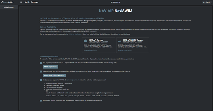 Screenshot of the frontpage of the Naviair implementation of System Wide Information Management, called NaviSWIM.